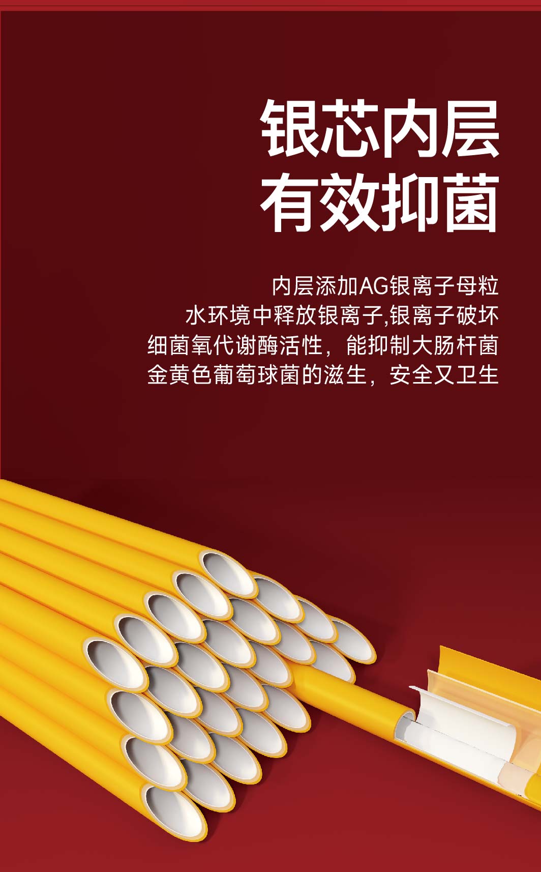 内层添加AG银离子母粒,水环境中释放银离子,银离子破坏细菌氧代谢酶活性,能抑制大肠杆菌、金黄色葡萄球菌的滋生;专利HI配方、改善了管材低温冲击性能,改善PPR管在冬季运输安装过程中的低温脆性问题;三层共挤工艺,较双层结构遮光改善,细菌藻类不易滋生。