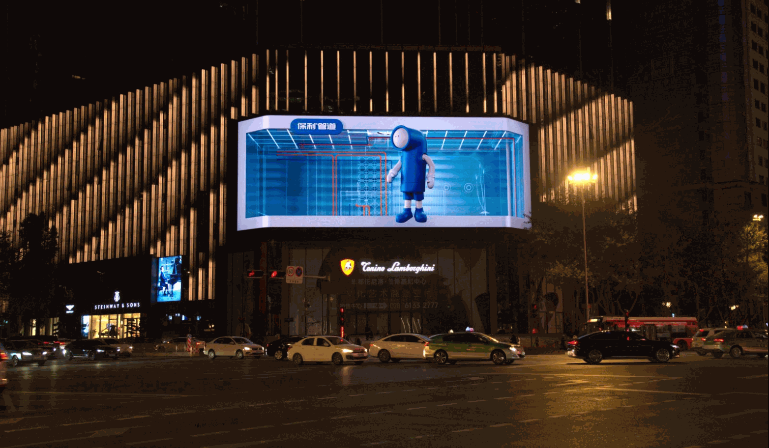 11月9日,蓝狮在线管道创意裸眼3D大片登陆成都兰博基尼中心,全片以蓝狮在线品牌IP形象“蓝宝”为主人公和视觉引导元素,向观众展示隐蔽工程系统。兰博基尼中心位于成都天府广场,是毋庸置疑的城市核心地段,出入和来往的人潮、车辆川流不息,炫目的视觉效果和俏皮的蓝宝,既富有创意又让人身临其境,行人纷纷驻足打卡。