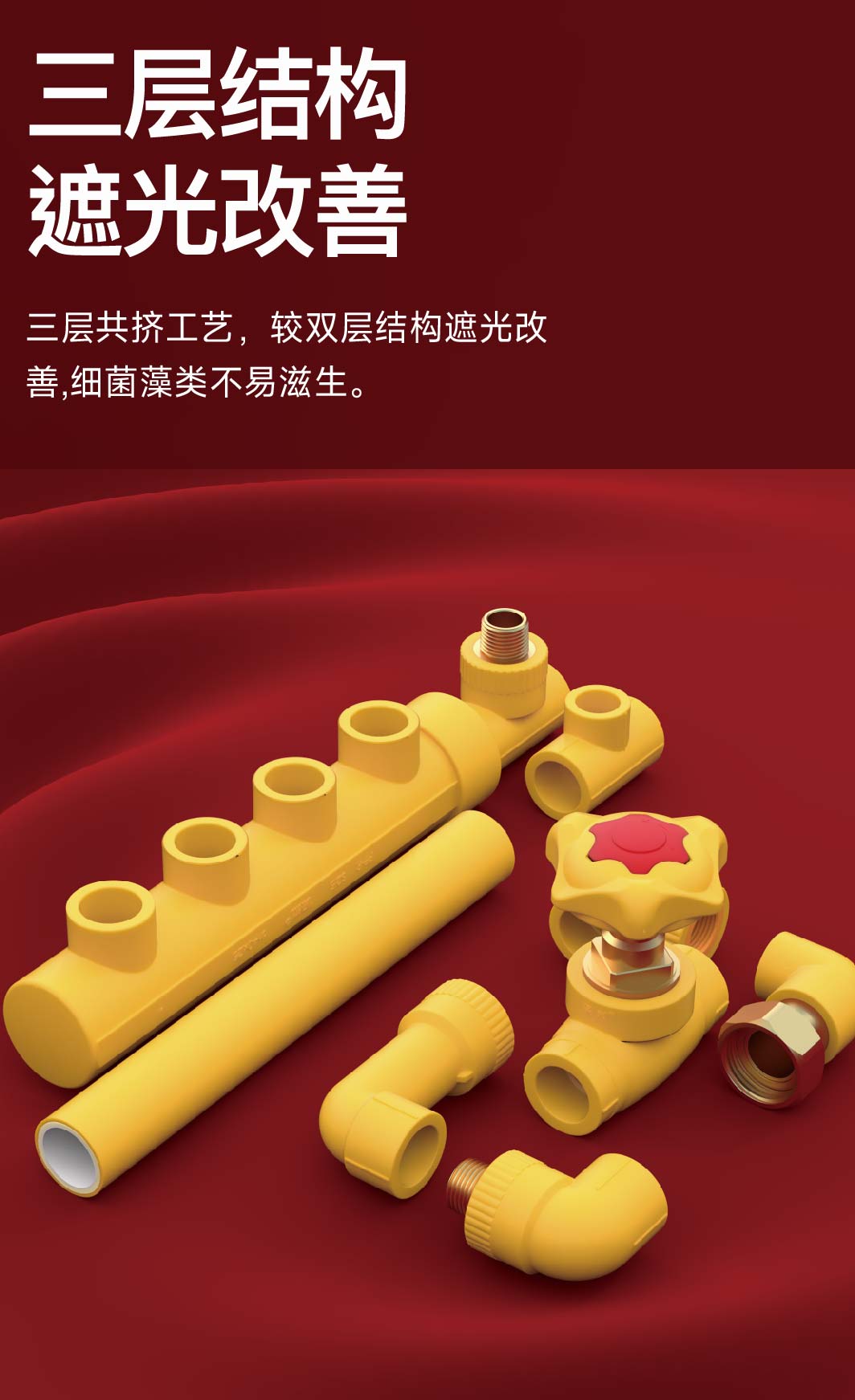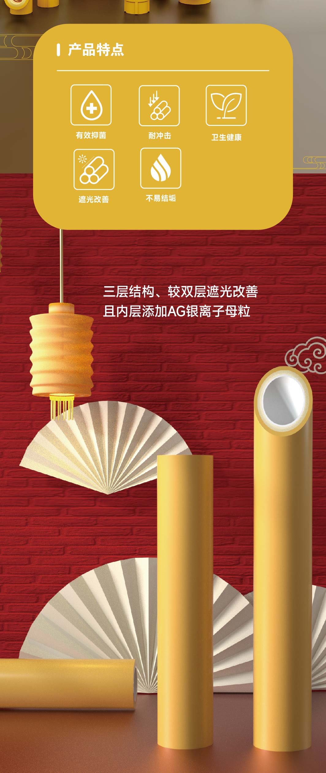内层添加AG银离子母粒,水环境中释放银离子,银离子破坏细菌氧代谢酶活性,能抑制大肠杆菌、金黄色葡萄球菌的滋生;专利HI配方、改善了管材低温冲击性能,改善PPR管在冬季运输安装过程中的低温脆性问题;三层共挤工艺,较双层结构遮光改善,细菌藻类不易滋生。