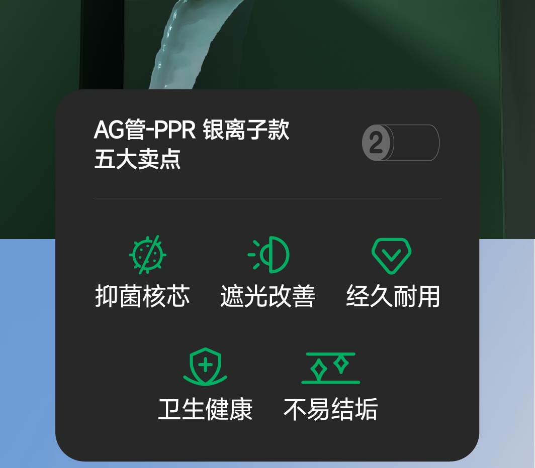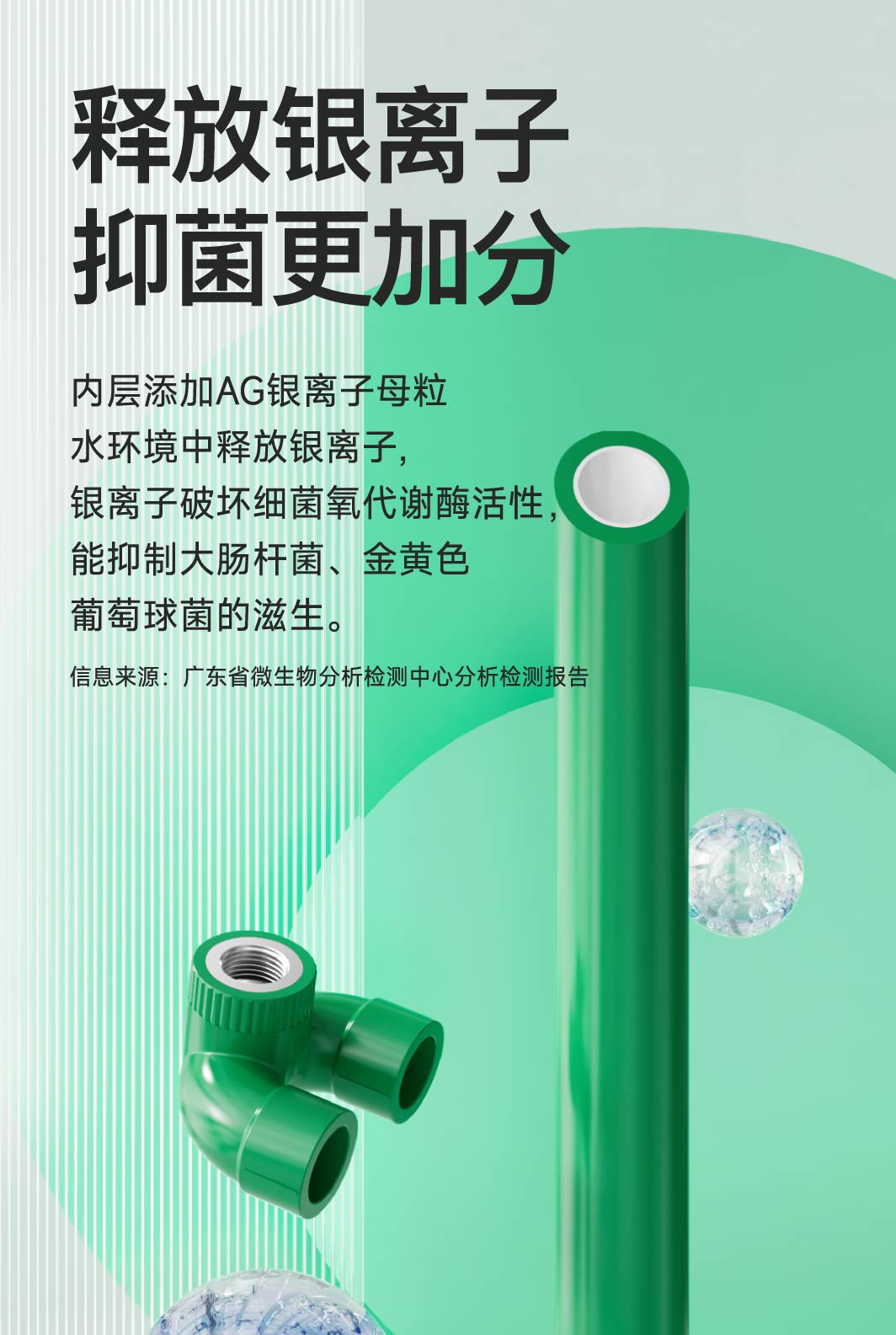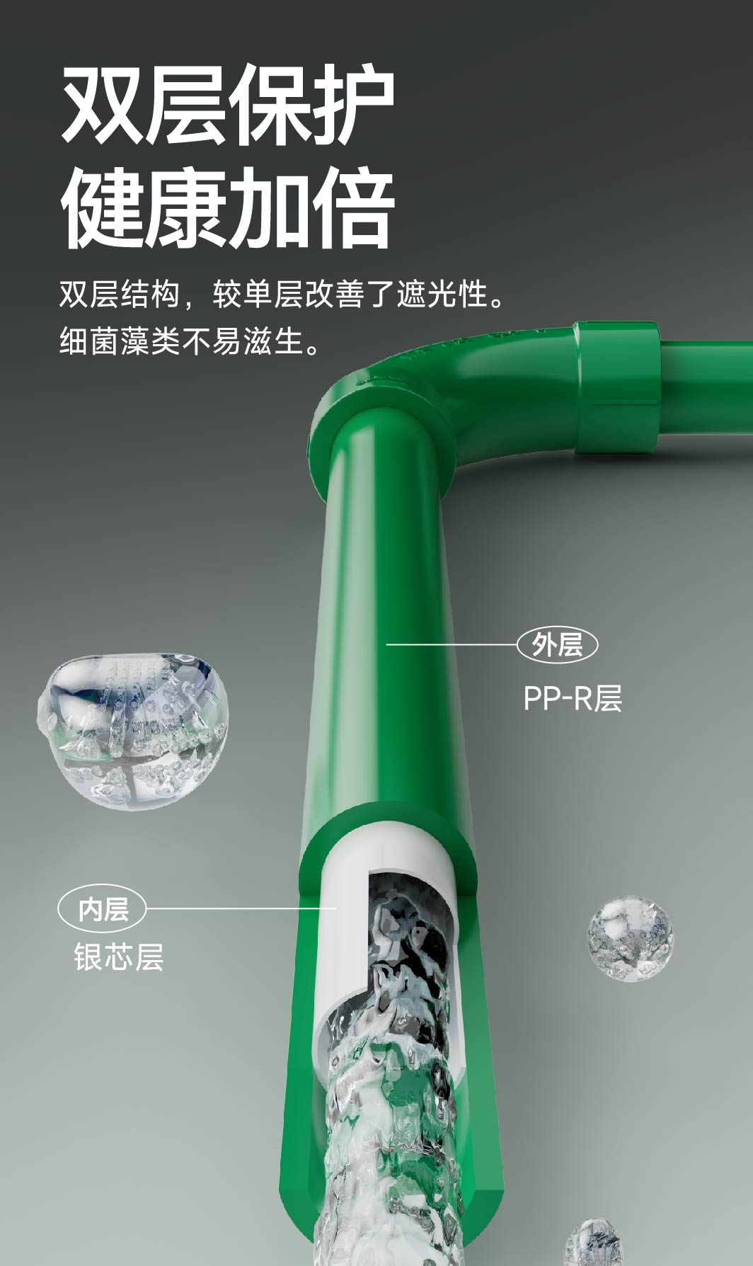 内层添加AG银离子母粒,水环境中释放银离子,银离子破坏细菌氧代谢酶活性,能抑制大肠杆菌、金黄色葡萄球菌的滋生。双层结构,较单层改善了遮光性。 细菌藻类不易滋生。