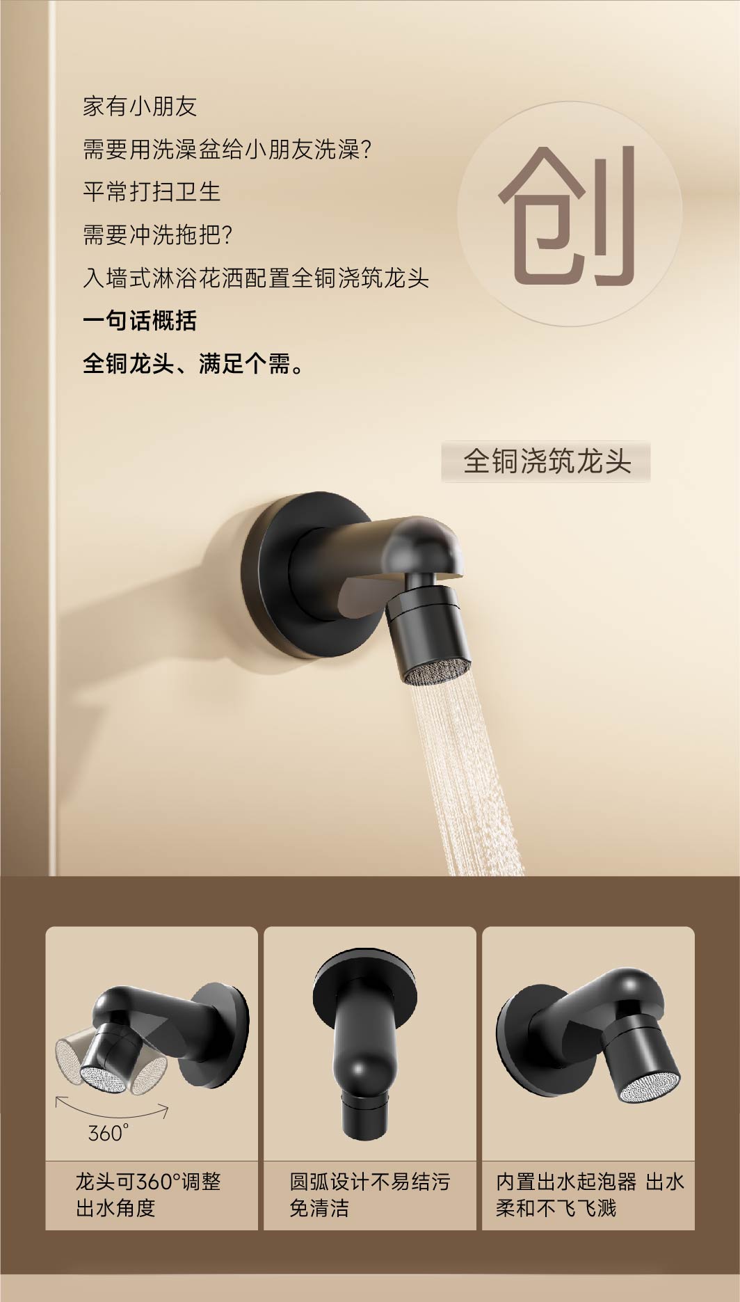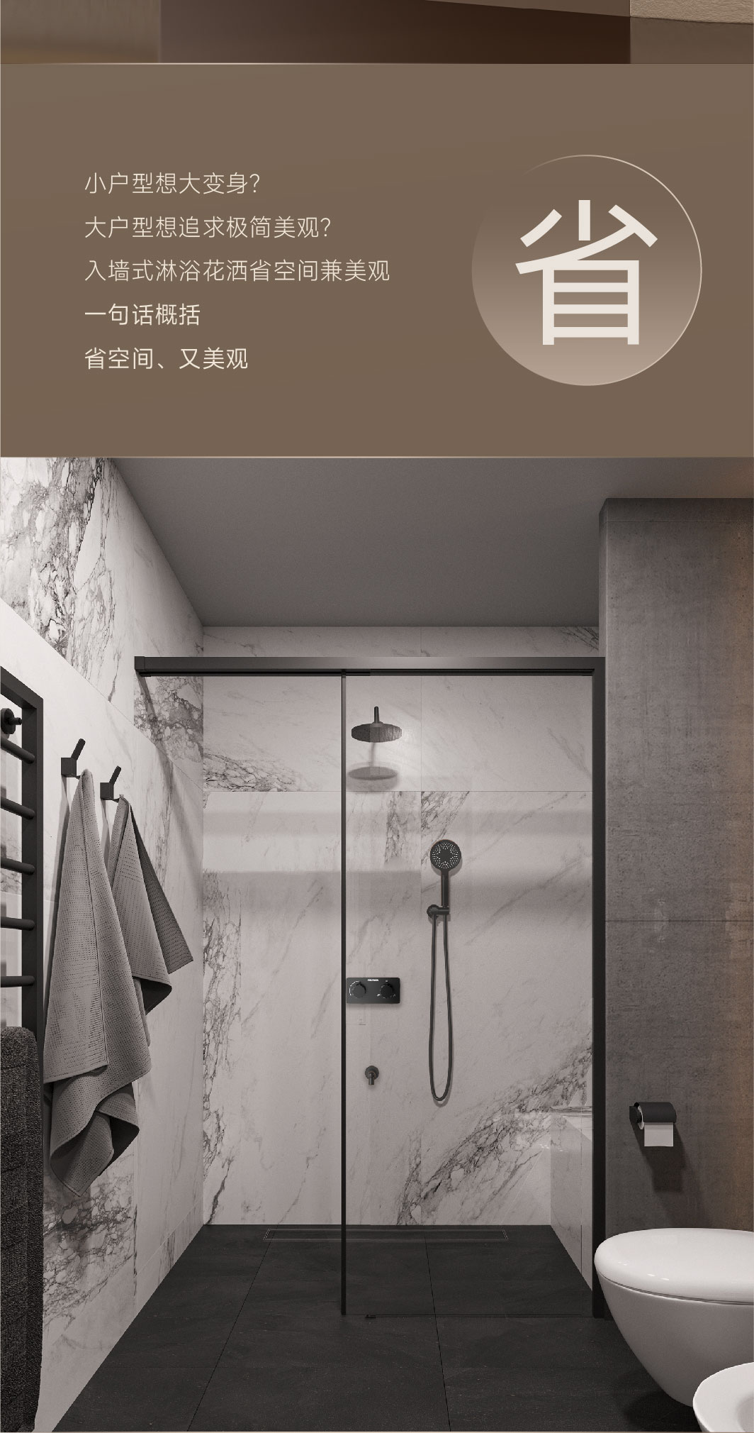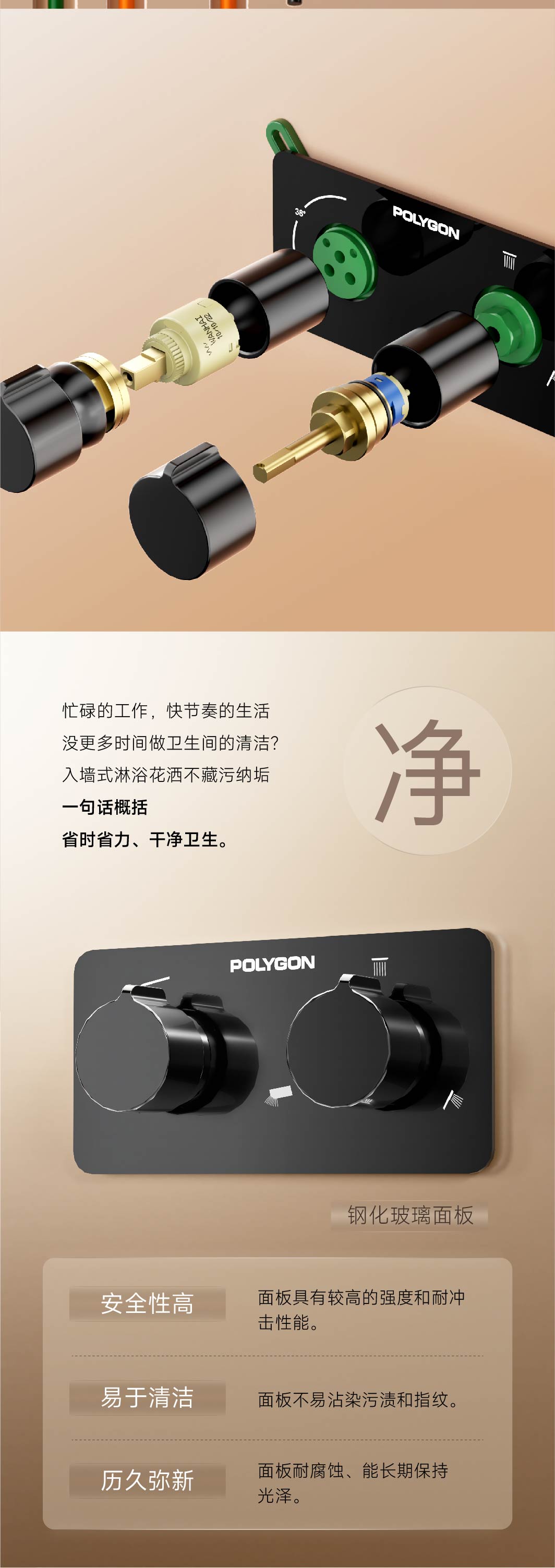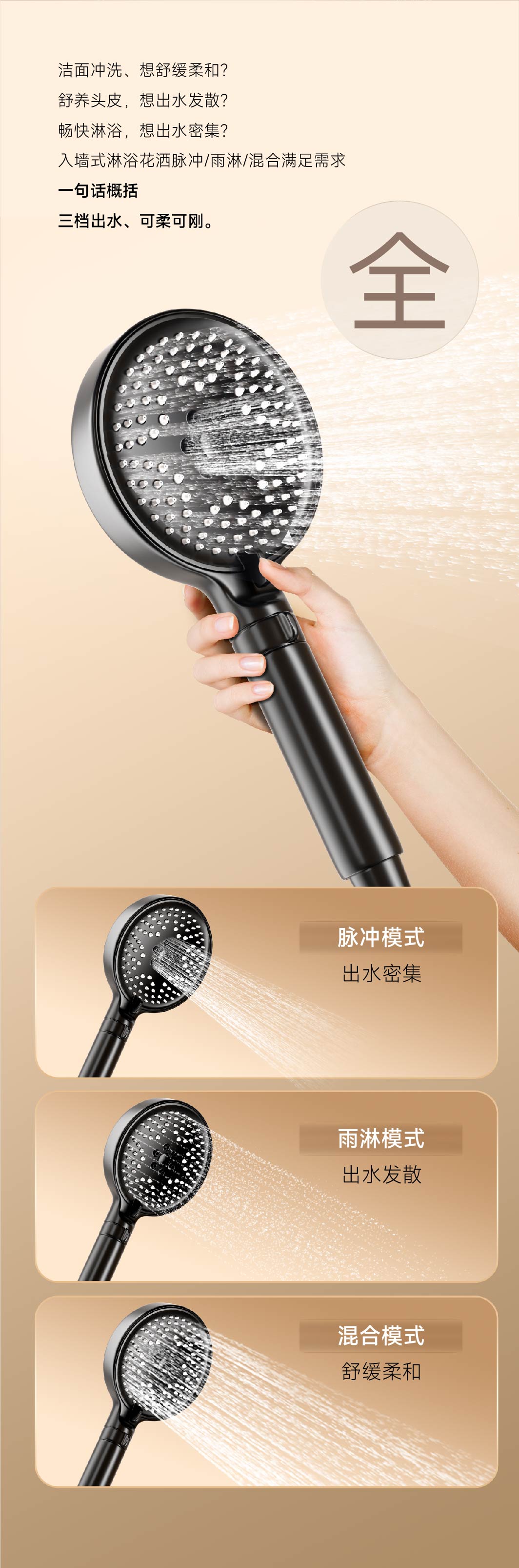 入墙设计、节省空间;三档出水、可刚可柔;可拆面板、维护无忧