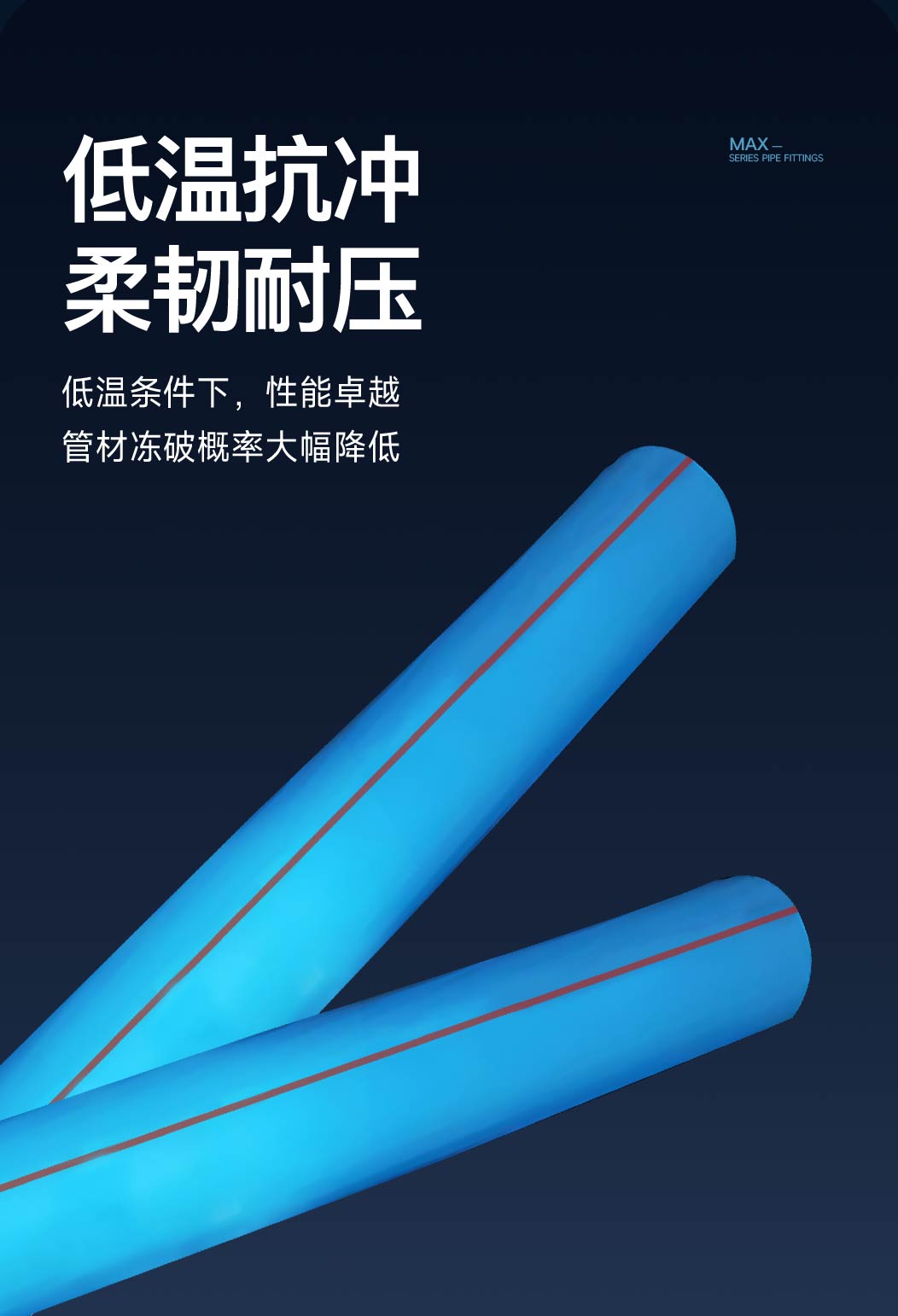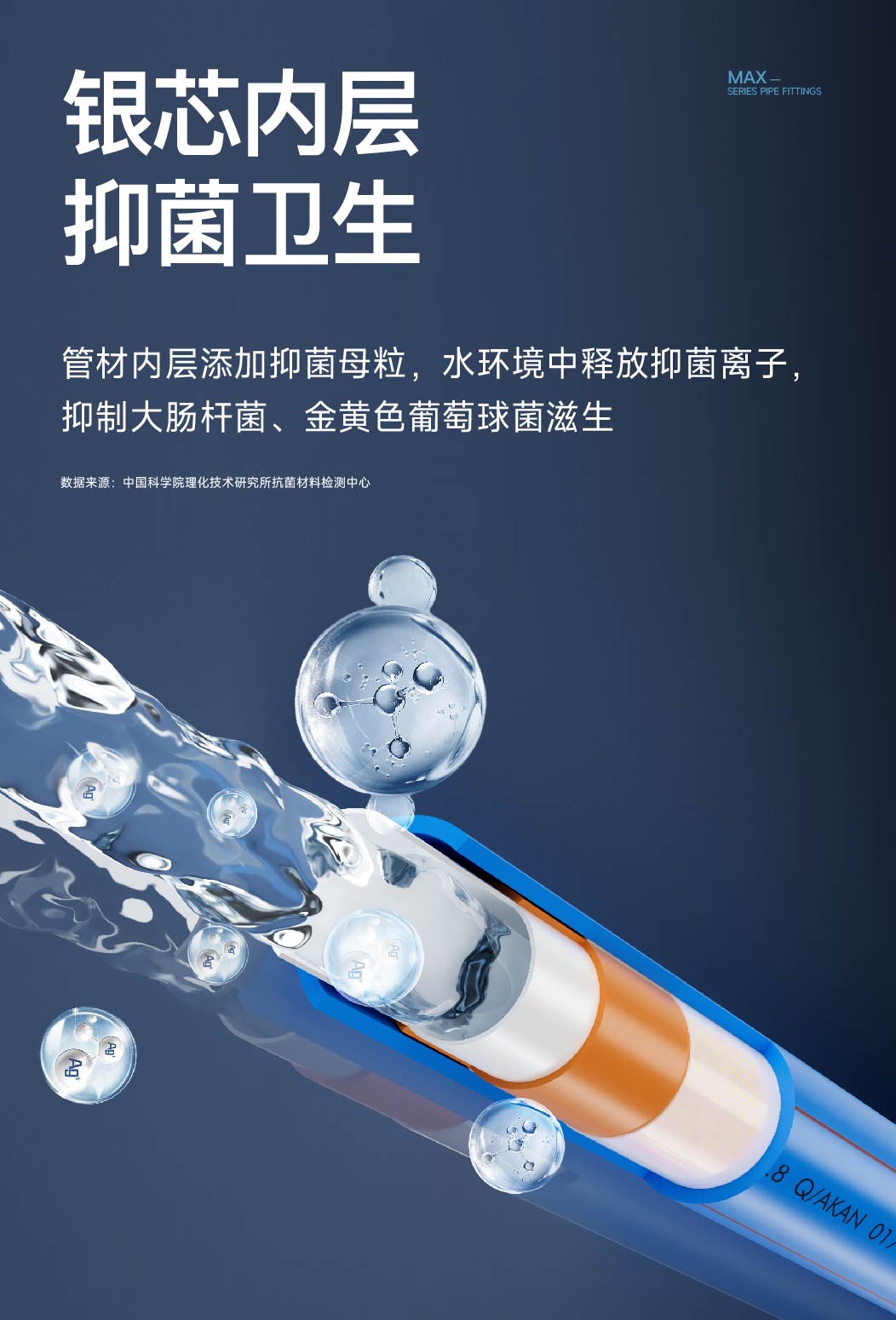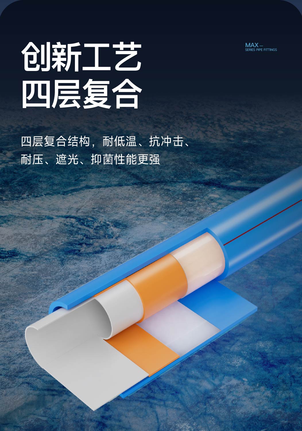 低温抗冲、柔韧耐压【低温条件下,管材冻破概率大幅降低】;创新工艺、四层复合【四层复合结构,耐低温、抗冲击耐压、遮光、抑菌性能更强】;银芯内层、抑菌卫生【管材内层添加抑菌母粒,水环境中释放抑菌离子,抑制大肠杆菌、金黄色葡萄球菌滋生;一管多搭、适配性强【可适配同规格普通/PLUS/PRO系列管件】