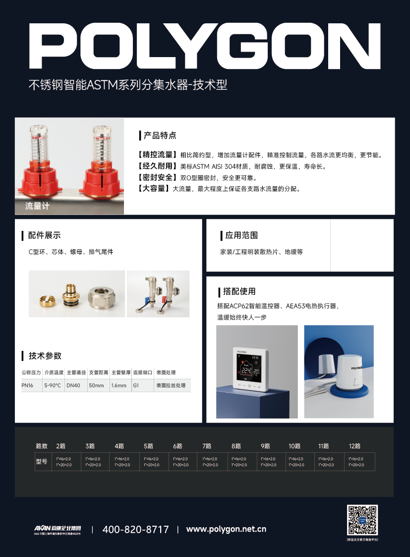 【精控流量】相比简约型,增加流量计配件,精准控制流量,各路水流更均衡,更节能。【经久耐用】美标ASTM AISI 304材质,耐腐蚀,更保温,寿命长。【密封安全】双O型圈密封,安全更可靠。【大容量】大流量,最大程度上保证各支路水流量的分配,