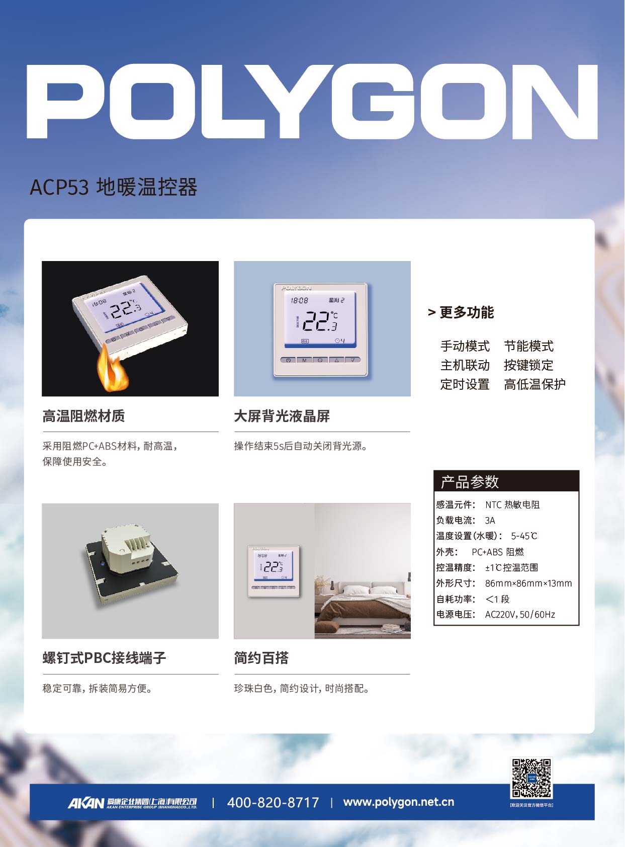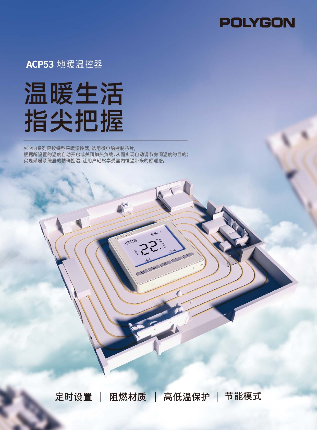 ACP53系列是按键型采暖温控器,选用微电脑控制芯片,根据所设置的温度自动开启或关闭加热负载,从而实现自动调节房间温度的目的,实现采暖系统里的精确控温,让用户轻松享受室内恒温带来的舒适感。
